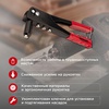 Заклепочник REXANT применяется для скрепления 2 и более деталей в труднодоступных местах. Подходит для скрепления предметов из металла, древесины, пластмассы, кожи. Оснащен 4 насадками разного диаметра под соответствующие заклепки. Для установки вытяжных заклепок необходим доступ к скрепляемым поверхностям лишь с одной стороны, что значительно упрощает работу. Корпус инструмента изготовлен из высококачественной стали, которая обеспечивает прочность инструмента. Резиновые накладки на рукоятках эргономичной формы делают работу более комфортной, а специальная скоба на конце упрощает хранение заклепочника. Инструмент укомплектован ключом для установки и подтягивания насадок. Использован механизм, позволяющий снизить усилие на рукоятях. Заклепок в наборе: 60 шт.: 2.4 мм – 15 шт.; 3.2 мм – 15 шт.; 4 мм – 15 шт.; 4.8 мм – 15 шт. Подходящие артикулы заклепок: 12-5341, 12-5342, 12-5343, 12-5344, 12-5351, 12-5352, 12-5353, 12-5354, 12-5355, 12-5356, 12-5362, 12-5363, 12-5364, 12-5365, 12-5366.